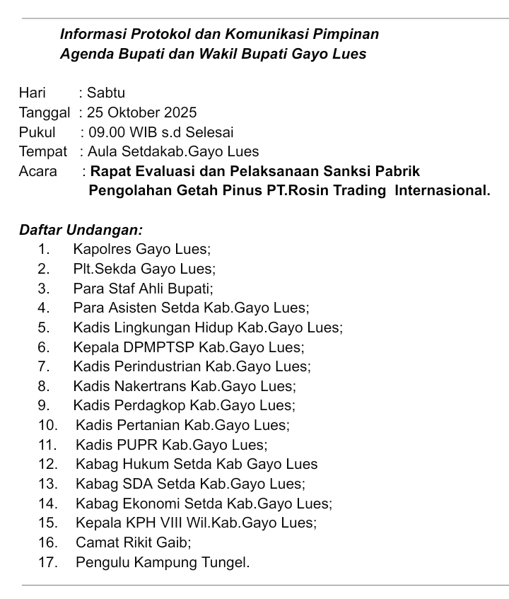 Meski Pemerintah Daerah (Pemda) Gayo Lues telah melakukan rapat koordinasi khusus untuk membahas rapat Evaluasi Pemberian Sanksi tertanggal 25 oktober 2025,hingga kini aktivitas pabrik tersebut, namun di lapangan, kegiatan produksi justru masih berlangsung seperti biasa.